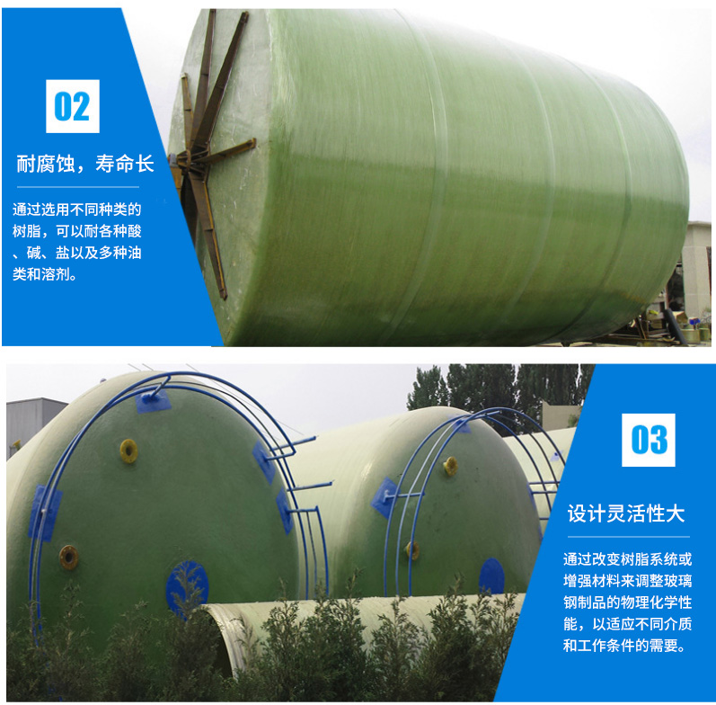 ③設計靈活性大,罐壁結構性能優異:通過改變樹脂系統或增強材料來調整玻璃鋼制品的物理化學性能,以適應不同介質和工作條件的需要。通過結構層厚度、纏繞角和壁厚結構的設計來調整罐體的承載能力,制成不同壓力等級或某些特殊性能的玻璃鋼貯制品,這是各向同性的金屬材料無法比擬的。